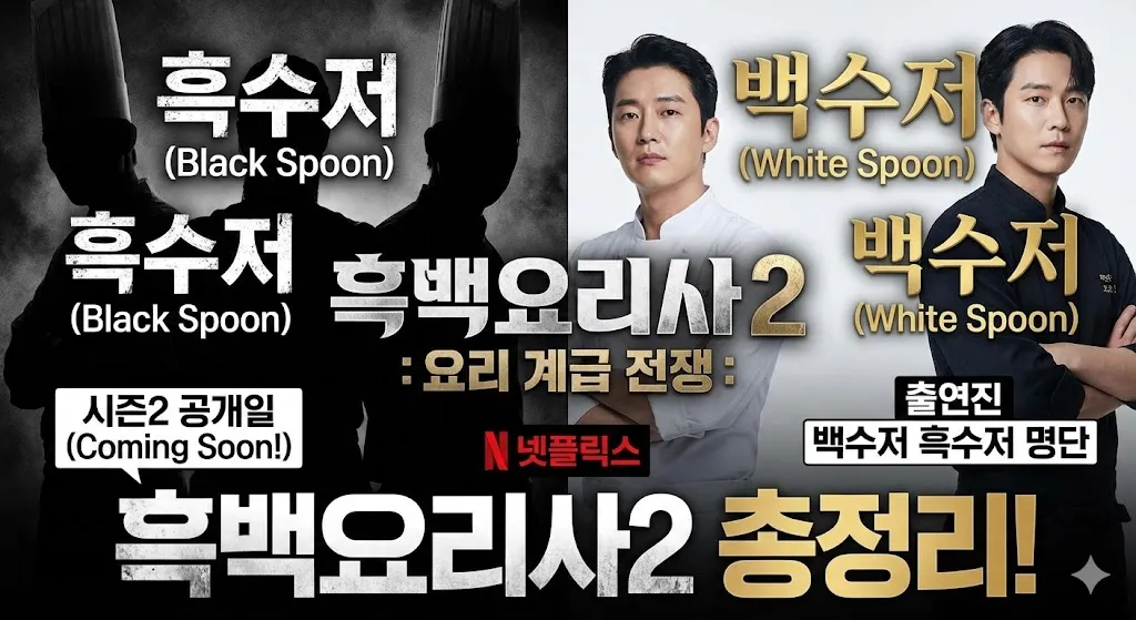 흑백요리사2가 2025년 12월 16일 넷플릭스에서 공개됩니다. 시즌1의 글로벌 신드롬에 이어 더욱 화려해진 출연진과 새로운 룰로 돌아온 흑백요리사 시즌2의 다시보기 방법, 공개일, 백수저·흑수저 출연진 명단을 상세히 정리했습니다.